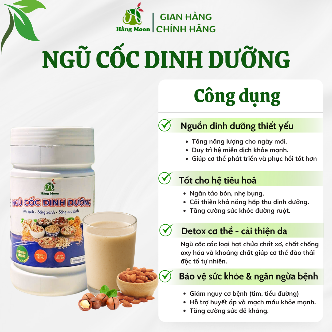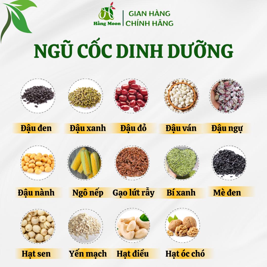 Thành phần | Hạt óc chó, điều sữa, yến mạch, hạt sen, mè đen, bí xanh ấn độ, gạo lứt rẫy, đậu đen xanh lòng hạt nhỏ, đậu xanh, đậu đỏ, đậu ván, đậu ngự, ngô nếp, đậu nành. |