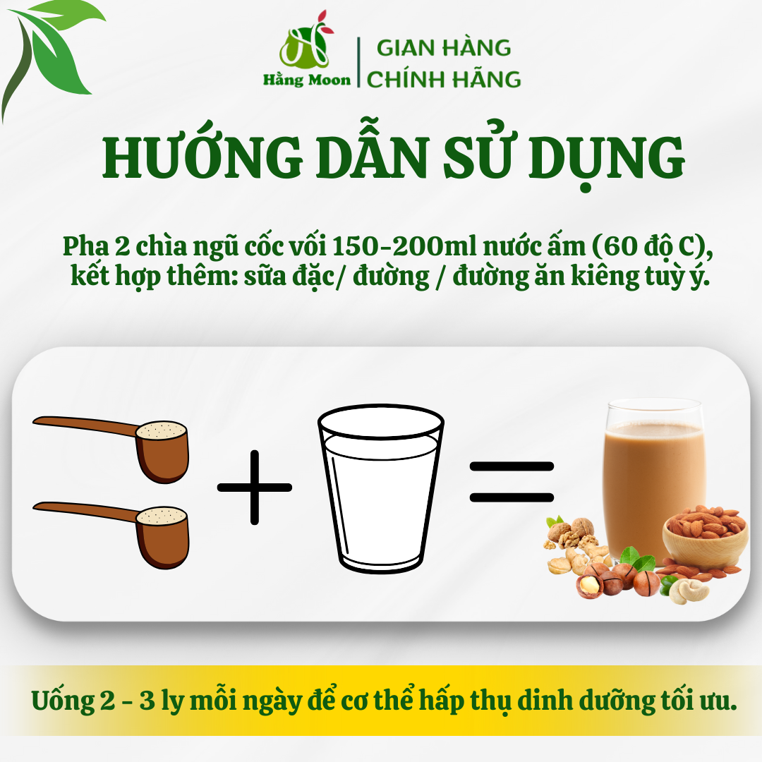 - Thành phần: Hạt hạnh nhân, óc chó, hạt chia, macca, điều sữa, yến mạch, hạt sen, ý dĩ, mầm gạo lứt rẫy, mầm đậu đen xanh lòng, mầm đậu đỏ, mầm đậu xanh, tinh bột nghệ nguyên chất.